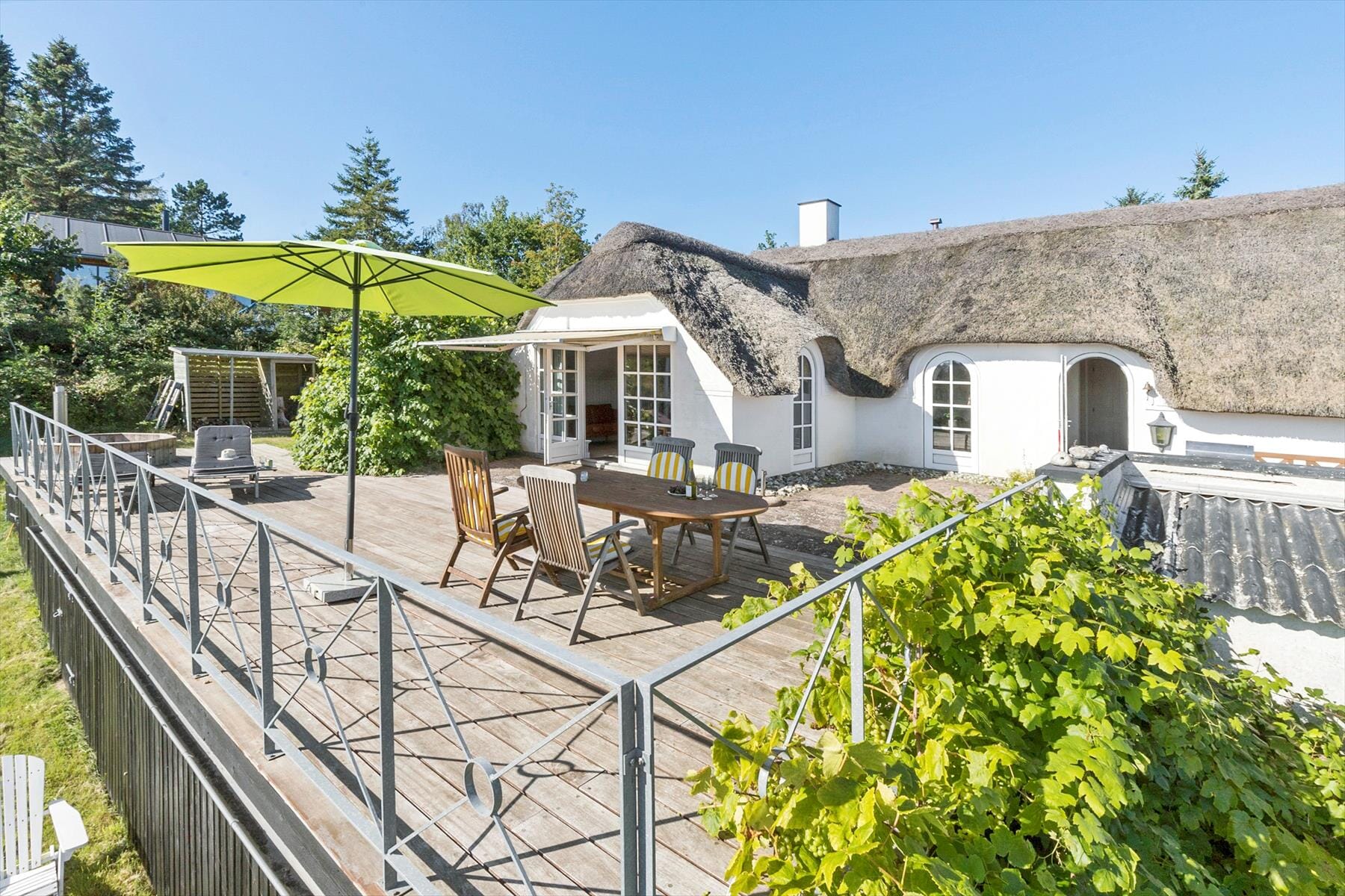 Sommerhuset er beliggende på stor ugenert grund med en fantastisk udsigt. Fra stuen er der udgang til en stor og træ terrasse med "hav kig", flere solkroge og gode havemøbler overalt. Maden kan laves på den fine gasgrill. Haven er dejlig stor og delvis ”vild med vilje”. Et stykke af haven ligger i plan, så der er også mulighed for leg og boldspil.