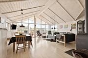 Dette attraktive og velholdte feriehus forkæler dig med en skøn kombination af hygge og komfort. Efter en dag fyldt med oplevelser kan du slappe af i den lyse og indbydende stue, hvor en brændeovn og en varmepumpe sørger for behagelige temperaturer. Fra stuen har du direkte adgang til en dejlig terrasse, hvor du allerede fra morgenstunden kan nyde morgenmaden i solen sammen med dine kære. Køkkenet er åbent forbundet med stuen og er fuldt udstyret – her gør opvaskemaskinen hverdagen lidt lettere. Feriehuset har fire soveværelser og giver plads til hele familien. To af værelserne har en dobbeltseng, mens de to andre er indrettet med køjesenge. En særlig fordel ved huset er de to flotte badeværelser, hvoraf det største er udstyret med spabad og sauna – perfekt til afslappende øjeblikke med et strejf af wellness.