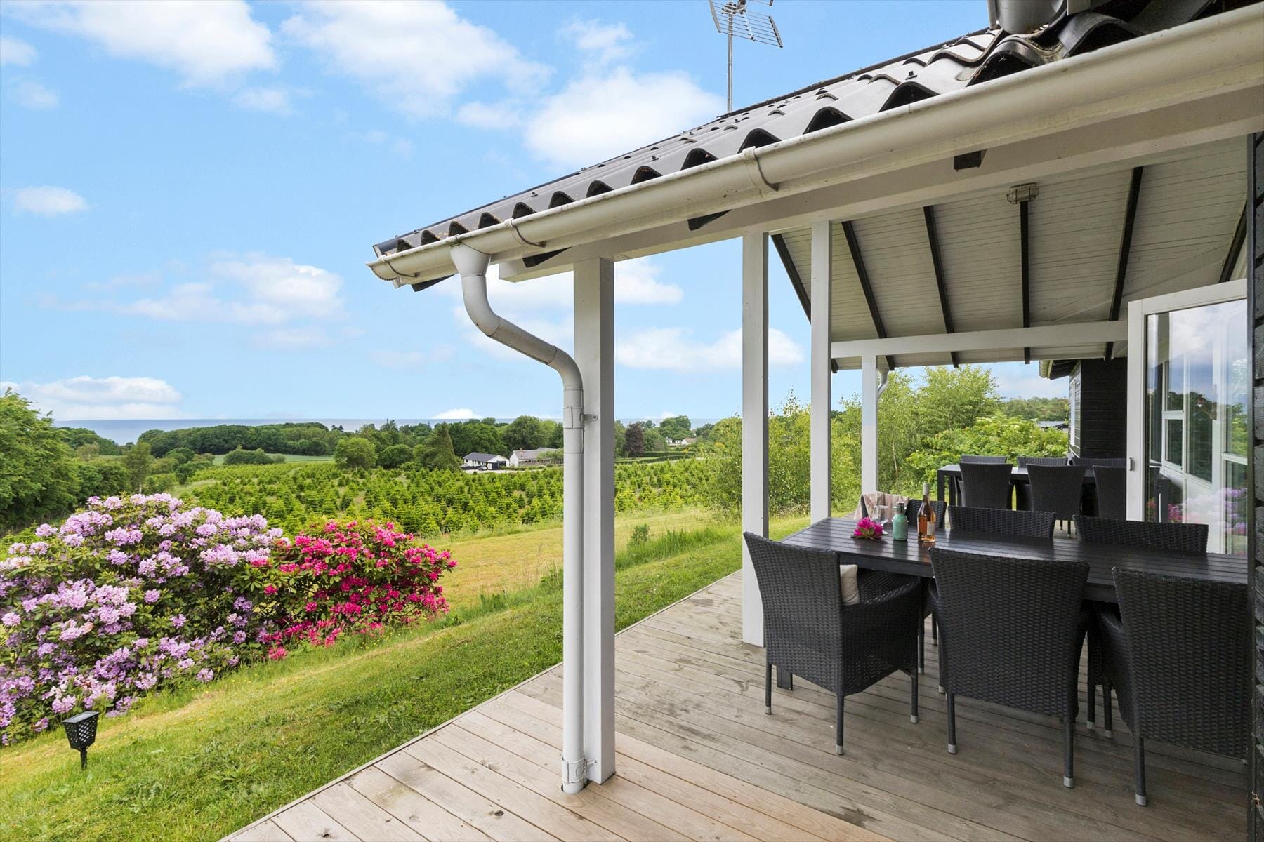 Start dagen med morgenkaffen i den hyggelige solgård, der ligger i direkte forlængelse af køkkenet og som bader jer i morgensolens varme stråler. Som dagen skrider frem, kan I rykke over på den store, overdækkede terrasse, der nås direkte fra stuen. Her kan I sidde komfortabelt i de gode havemøbler og nyde maden fra grillen, lade blikket hvile i den smukke havudsigt, imens I kærligt holder øje med børnene, der lystigt hopper på trampolinen og leger på græsplænen.