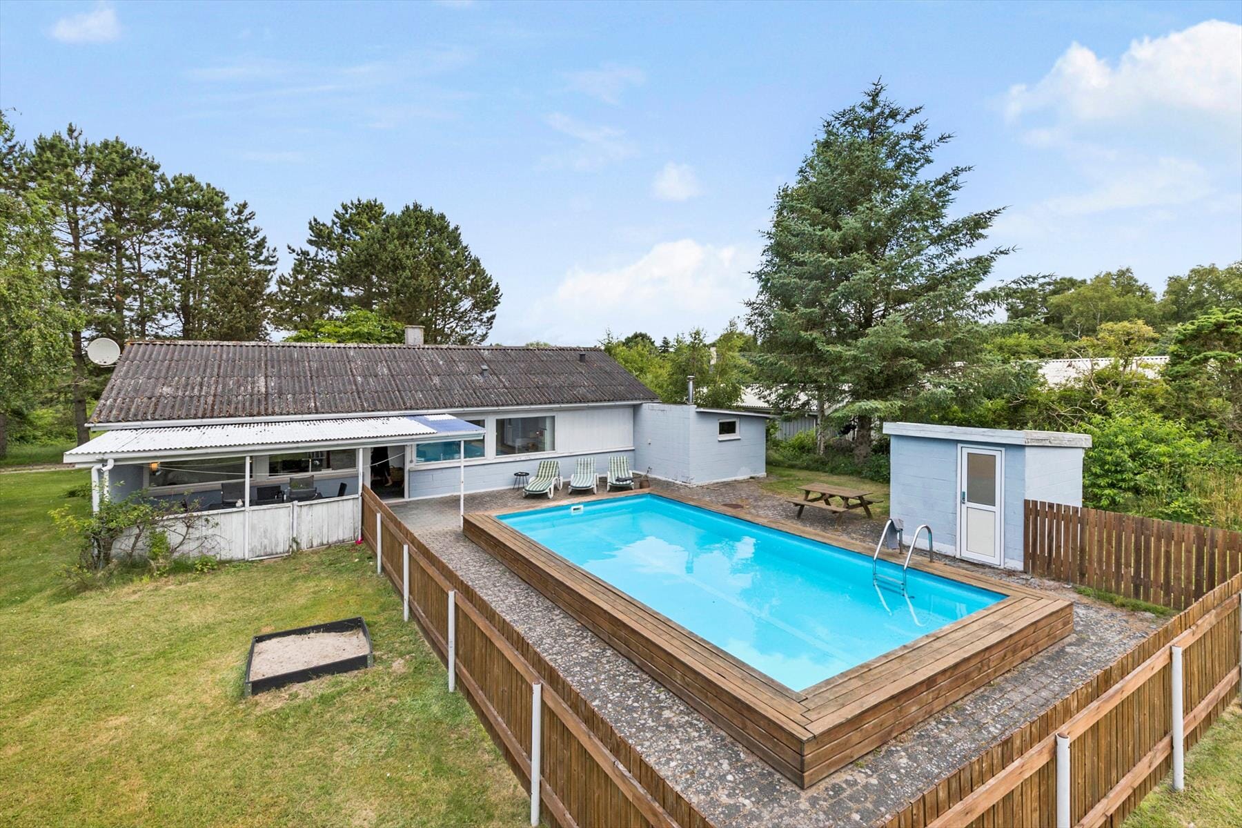 Er der noget bedre end at tilbringe feriedagene udendørs? Med dette feriehus får I en skøn, afskærmet terrasse med havemøbler, hvor I kan nyde dagens måltider og de lune aftener. Den private pool som er åben fra 1. maj til 1. oktober, giver mulighed for at tage en dukkert lige når det passer jer – og så er der selvfølgelig også grill, hvor I kan sætte gang i sommerstemningen og tilberede lækre måltider under åben himmel. Her er alle forudsætninger for at nyde livet udenfor, uanset om solen skinner fra en skyfri himmel, eller I får brug for en lille pause i skyggen.