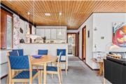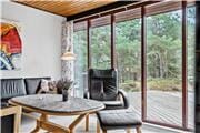 Huset er bygget i 1975 og har i 2006 gennemgået en delvis renovering. Stue, spiseområde og det åben køkken deles om pladsen, det hele er hyggeligt indrettet og de store panoramavindue giver et fantastisk lys og en storslået udsigt over området. Skulle det ske at det en aften er lidt køligt er der en pejs til varme og hygge. Der er skydedør til terrassen herfra. Køkkenet er rummeligt og godt indrettet. Der er 2 soveværelser, 1 med dobbeltseng og et med 2 enkeltsenge, begge soveværelser har egen udgang til terrassen. Badeværelset er enkelt og praktisk indrettet. Et rigtig godt hus til den lille familie.