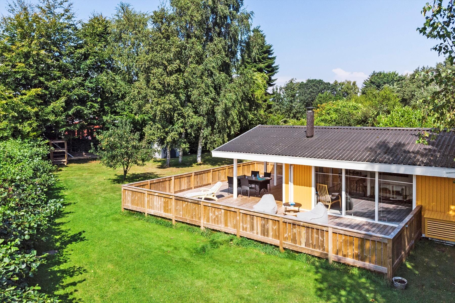 Fritidshuset er beliggende på en 1007 kvm stor grund i et roligt område i det nordlige Marielyst. Udendørs er der en stor lækker træterrasse godt indrettet med masser er siddepladser, grill og en stor græsplæne med masser af plads til at børnene kan lege.