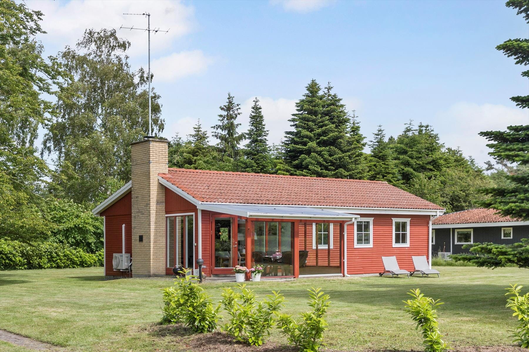 Dette skønne fritidshus er beliggende på en 1282 kvm stor grund, med stor græsplæne hvor der er plads til leg og diverse aktiviteter. Feriehuset byder på en skøn terrasse som er delvist overdækket. På terrassen finder man havemøbler og grill.