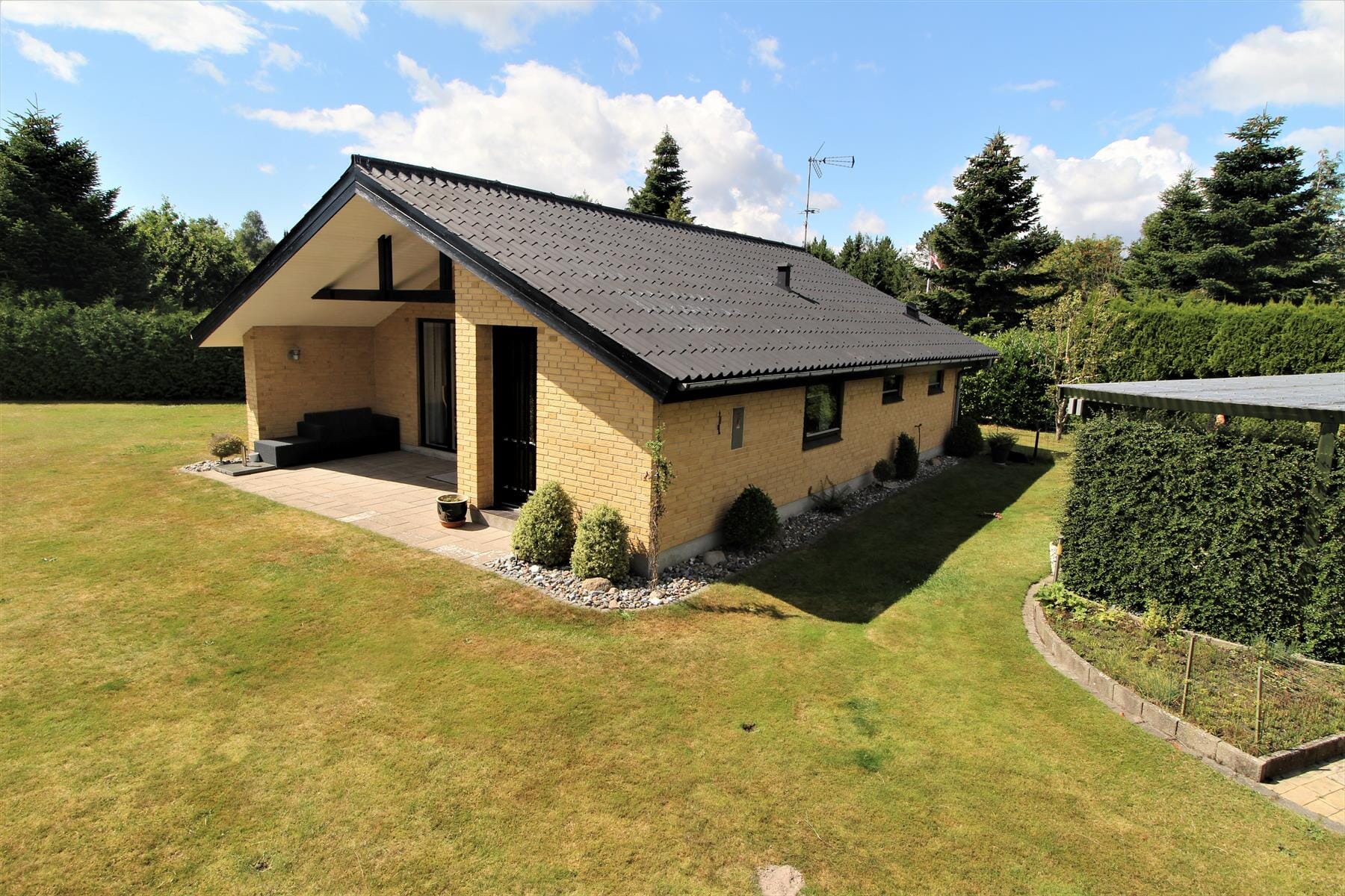 Fra stuen træder I ud på den gode overdækkede terrasse. Her er havemøbler, grill og direkte udgang til den store græsplæne med godt med plads på den store grund til at børnene kan spille bold, lege gemmeleg eller at hele familien kan tage et spil kongespil.