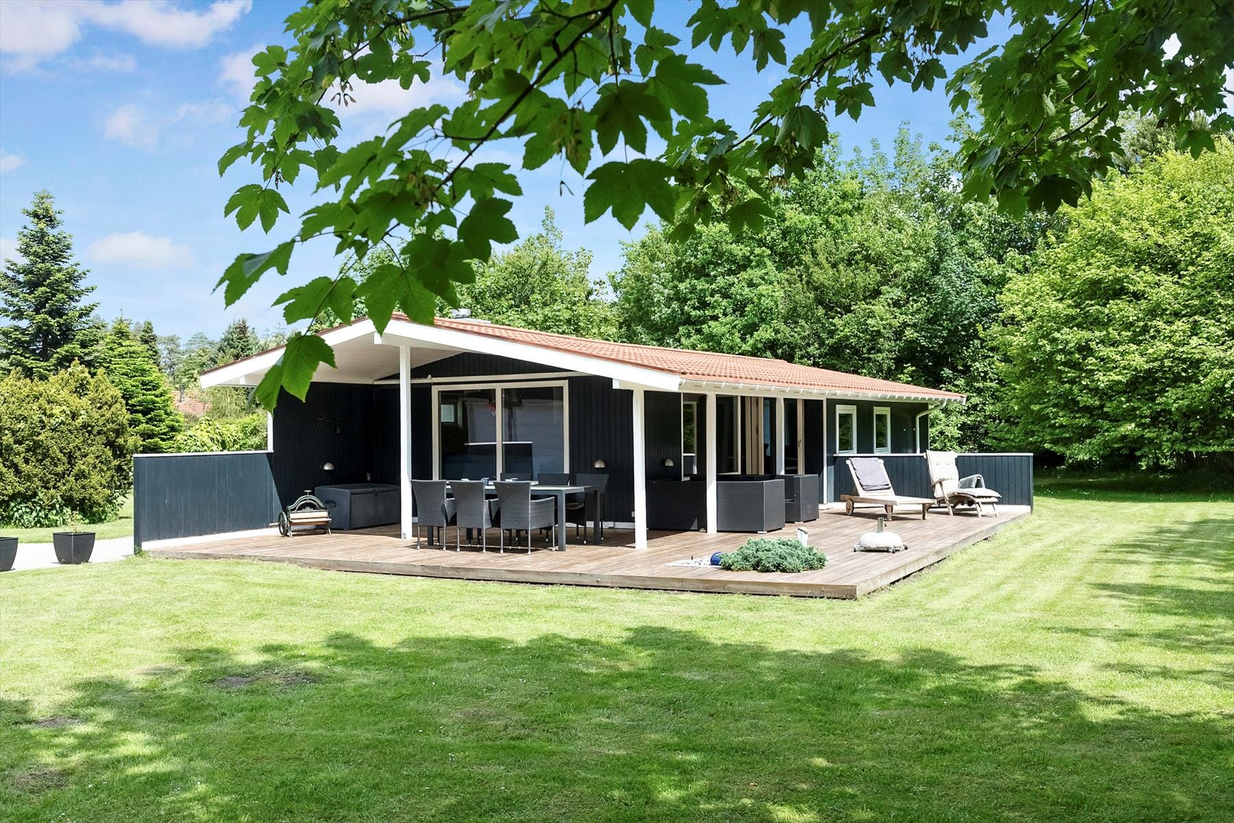 Fritidshuset er beliggende på en 1972 kvm stor grund, der har en stor græsplæne til masser af boldspil og leg med hele familien, og ikke mindst den dejlige træterrasse, hvor sommervarmen rigtig kan nydes, samt et hyggeligt bålsted. Derudover er der basketballkurv til feriehuset.