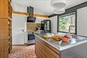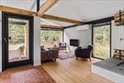 Åbent Køkken/ Alrum med hyggelig stue, samt soveværelse med lille dobbeltseng og stort vindue til naturhaven.