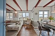 Fra første øjeblik fornemmer du den indbydende stemning, der præger sommerhuset. Indenfor mødes du af en varm atmosfære og et stilfuldt interiør med sans for detaljer. Opholdsrummet er husets hjerte – et dejligt sted at samles foran brændeovnen eller nyde måltider omkring spisebordet, mens lyset strømmer ind gennem de store vinduespartier. Køkkenet er både hyggeligt og funktionelt, og med udsigt til de naturskønne omgivelser bliver selv madlavningen en fornøjelse. I de rummelige soveværelser er der tænkt på komfort, så du kan vågne veludhvilet til en ny dag fuld af oplevelser. Det lille, lyse badeværelse har en enkel og funktionel indretning med bruser, toilet og håndvask. Her får du et praktisk rum, der giver en frisk og behagelig start på dagen under ferien.