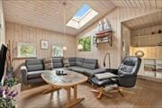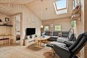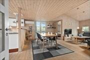 Sommerhuset har en god og velfungerende indretning, der fint kan rumme seks personer – så måske kan du endda invitere bedsteforældrene eller et par gode venner med på ferien. I opholdsafdelingen ligger køkken og stue i åben forbindelse, og det er det helt oplagte samlingspunkt, for her er der god plads til at lave mad, sidde omkring spisebordet og flade ud i sofaafdelingen. Ovenlyset og de store vinduespartier ud mod terrassen lader solen kigge indenfor, og hvis det er køligt i vejret, står en brændeovn klar til at sprede både hyggestemning og varme. Er du i humør til wellness, er der både sauna og spabad på badeværelset, og når det er sengetid, kan du se frem til at få en god nats søvn på et af de tre soveværelser.