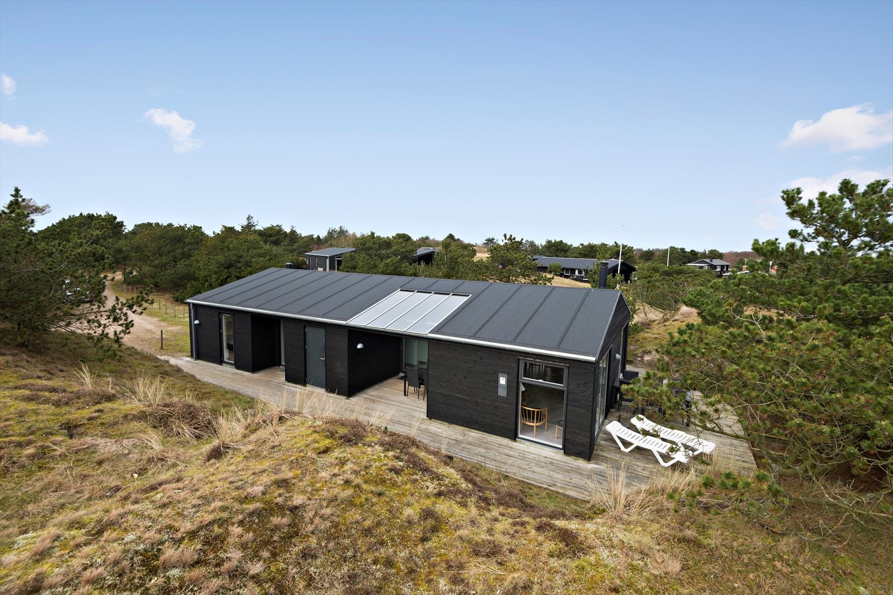 Sommerhusets planløsning er gennemtænkt, så både nattesøvnen, morgenbadet og de sociale stunder kan udspille sig i skønne omgivelser. I den ene ende af huset ligger tre gode soveværelser og to pæne badeværelser samlet – det vil sige, at du har mulighed for at trække dig tilbage for at sove, selv hvis de andre skulle have lyst til at blive længe oppe for at høre musik og spille spil i opholdsafdelingen. Når I alle sammen hygger jer her, har I god plads til både sofaafslapning og lækre middage såvel som madlavning i det åbne og veludstyrede køkken. Der er brændeovn i det lyse og højloftede rum, og de store vinduespartier sørger for, at både solen og naturen bliver inviteret helt indenfor.