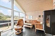 I ferieboligens stue går et kæmpe vinduesparti fra gulv til loft i gavlen, så selv på en kølig efterårsdag kan du blive badet i sol og nyde det naturskønne sommerhusområde fra sofaen eller lænestolen. Du kan endda tænde op i den væghængte brændeovn og lade varmen sprede sig – og hvis vejret er alt for sommerligt til det, kan du i stedet åbne havedøren op og smutte direkte ud på terrassen. Uanset årstiden har du gode arbejdsforhold, når du vil lave mad i det åbne og moderne indrettede køkken, og bordfodboldbordet skal nok vække glæde i familien blandt både store og små.