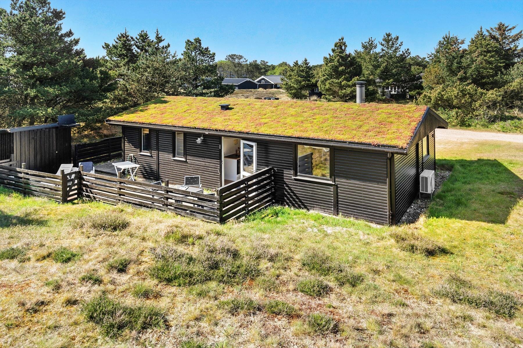 Det klassiske træhus ligger på en stor naturgrund, der har en varieret bevoksning med åbne arealer, tætte hybenbuske og krogede fyrretræer. Her kan du trække vejret dybt ned i lungerne og straks føle dig hjemme, for det er dejlige og velduftende omgivelser at opholde sig i – uanset om du leger med børnene på plænen eller slapper af i en havestol på husets dejlige terrasse. Terrassen er for øvrigt helt aflukket med hegn, så du kan drikke kaffe i ret ugenerede omgivelser, og hvis børnene er små, er det rart at vide, at de har en tryg ramme at hygge sig i.