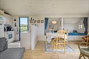 Når I træder indenfor, mærker I straks, at huset er bygget til både komfort og fællesskab. Det klassiske Orkidé-hus fra 1999 har et særligt charmerende udtryk, og de to store alkover i stuen indbyder til hyggelige stunder med spil, tegnepapir og ferieafslapning. De store vinduer lader dagslyset strømme ind og giver et fint kig til de grønne omgivelser, mens det åbne køkken og spiseområdet gør det nemt at være sammen på tværs af aktiviteter. Måske er nogen i gang med aftensmaden, mens andre slår sig ned med en bog eller bygger en hule i alkoven – der er plads til det hele. Indretningen er enkel, men varm, og her er tænkt over, hvordan både børn og voksne kan føle sig hjemme.