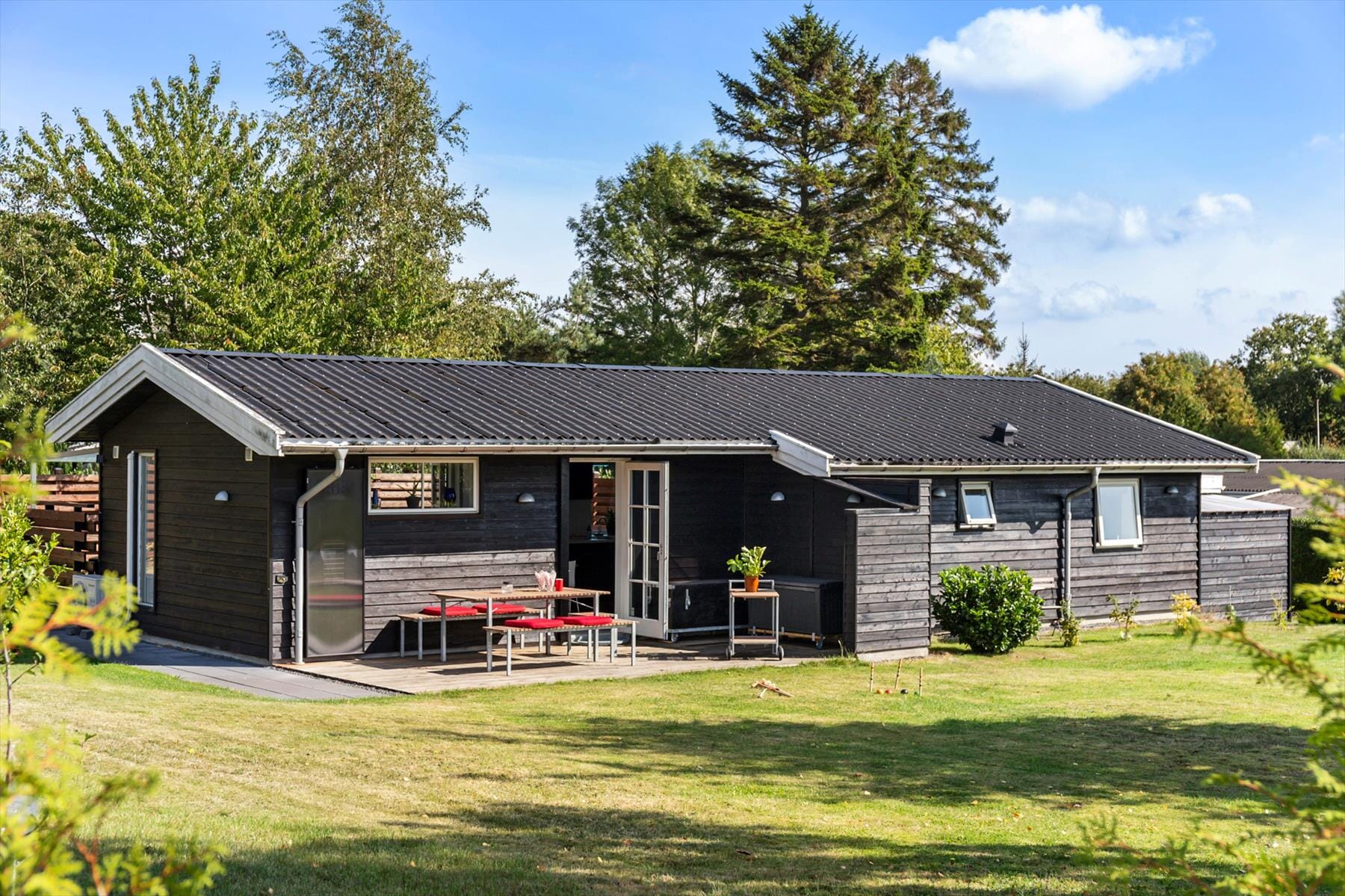 Haven er virkelig fin og byder på flere små kroge, der indbyder til udeliv fra morgen til aften. Her kan du finde sol, læ og skygge alt efter tidspunkt og humør, og beplantning samt hegn skaber en behagelig afskærmning mod omgivelserne. Selvom der er naboer, føles haven privat og rolig, understøttet af de store grunde omkring huset.