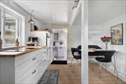 I denne sjældne feriebolig, som er en tilbygning til hovedhuset, kan du bo helt centralt i Danmarks eneste klippeby. Huset er hyggeligt indrettet og møbleret. Fra trappen op til huset kommer man ind i stue/værelse med soveplads og trappe til 1. sal. Videre herfra er der en hyggestue med spiseplads i tilknytning til det nye åbent køkken. Stuen er lys og indbydende med et dejligt opholdsområde med brændeovn og tv, som er åbent til forlængelse af spiseområdet. Fra det gamle køkken, mellem stue og det lille badeværelse, er der udgang til hyggelig og smukt beplantet gårdhave. Badeværelset er placeret et niveau ned og indrettet med toilet og bruseniche. På førstesalen er der soveværelse med dobbeltseng. Et hyggeligt ældre hus med flere niveauer og lavt til loftet - ikke et hus for dårligt gående.
