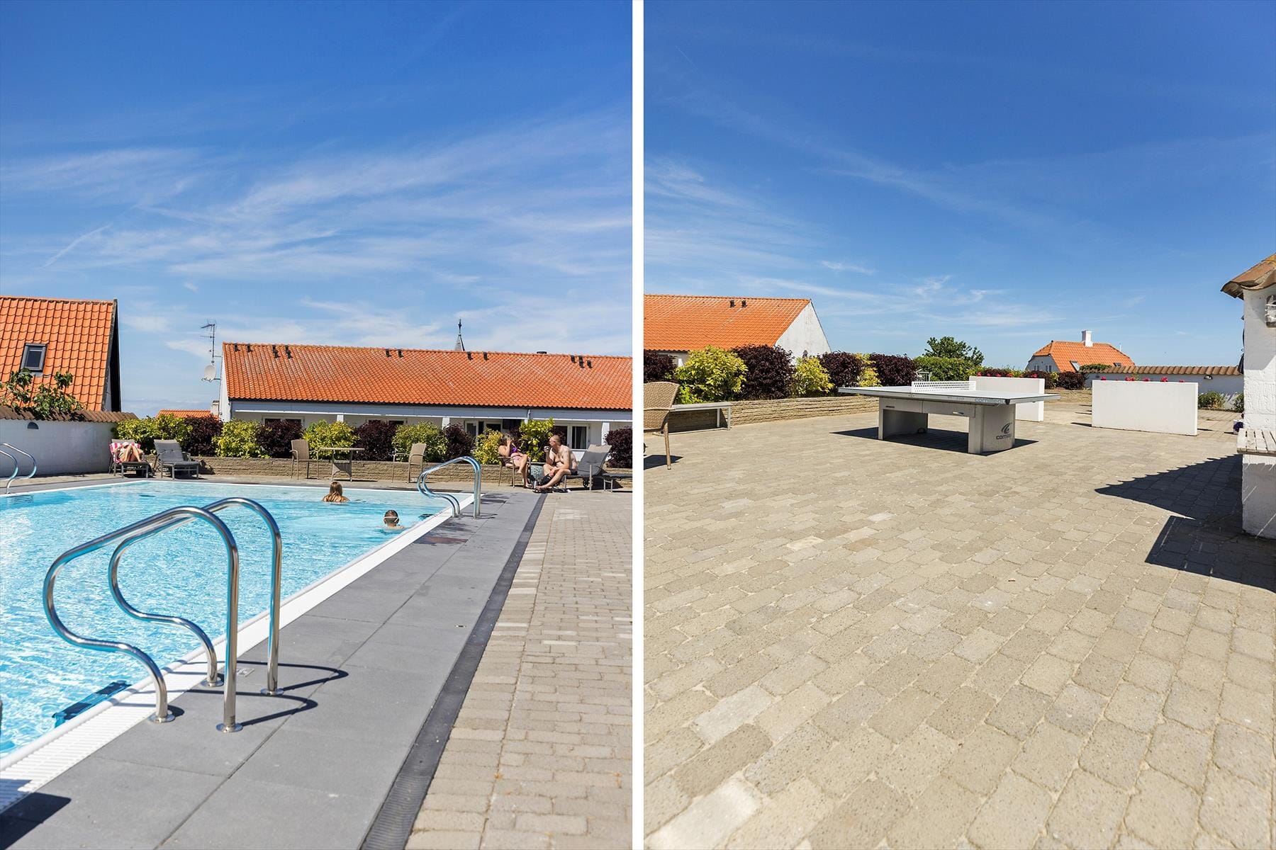 Terrassen vender ud mod en dejlig fælles gårdhave, som på en sommerdag har en sydlandsk stemning. Fællesområdet er en lukket have med pool og flere andre aktivitetsmuligheder. Poolen er åben om sommeren. Der er parkeringsmuligheder tæt ved lejligheden.