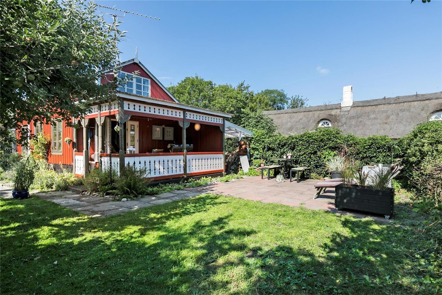 Haven er hyggelig med gamle frugttræer og en velpasset plæne. Der er en møbleret terrasse hvor solen kan nydes og en smuk overdækket terrasse hvor det er muligt at nyde dagen gå på hæld. Soveværelset på første sal har udgang til balkon. Et rigtigt hyggeligt sted at nyde sin ferie. Der er mulighed for parkering på parkeringspladsen ved landbrugsmuseet, ca. 100 m fra huset.