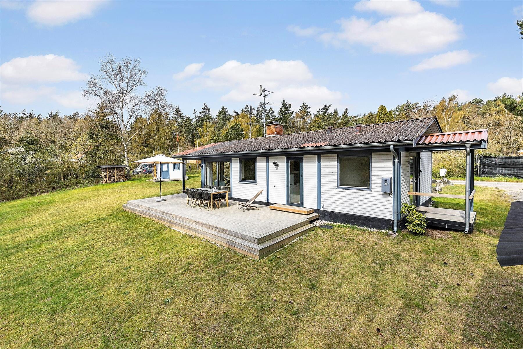 Den 3000 m2 store grund er foruden haven et stykke natur med et rigt dyreliv og en lille å i den bageste del. Her er gode muligheder for spil og leg eller nyd livet på terrassen, der er delvist overdækket og udstyret med udendørs møbler, måske kommer der et af områdets dyr forbi.