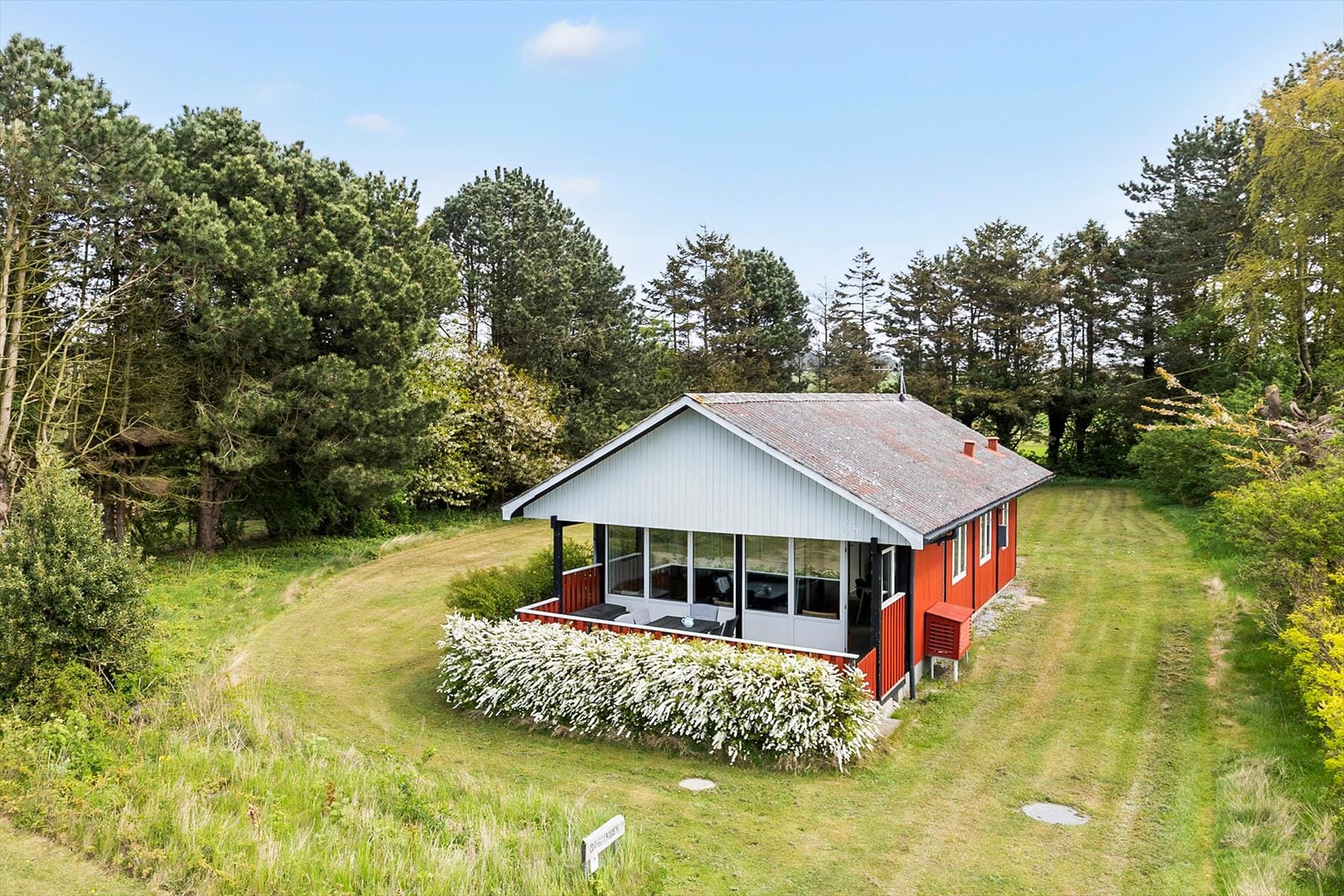 Hyggelig stue kombineret med spiseplads og åbent køkken. Udgang til delvis overdækket terrasse fra stuen. Havudsigt fra stuen og terrassen, hvor man rigtig kan sidde og nyde den smukke solnedgang. Et soveværelse med dobbeltseng, et soveværelse med to enkeltsenge og et værelse med en daybed. Lille badeværelse med bruser.