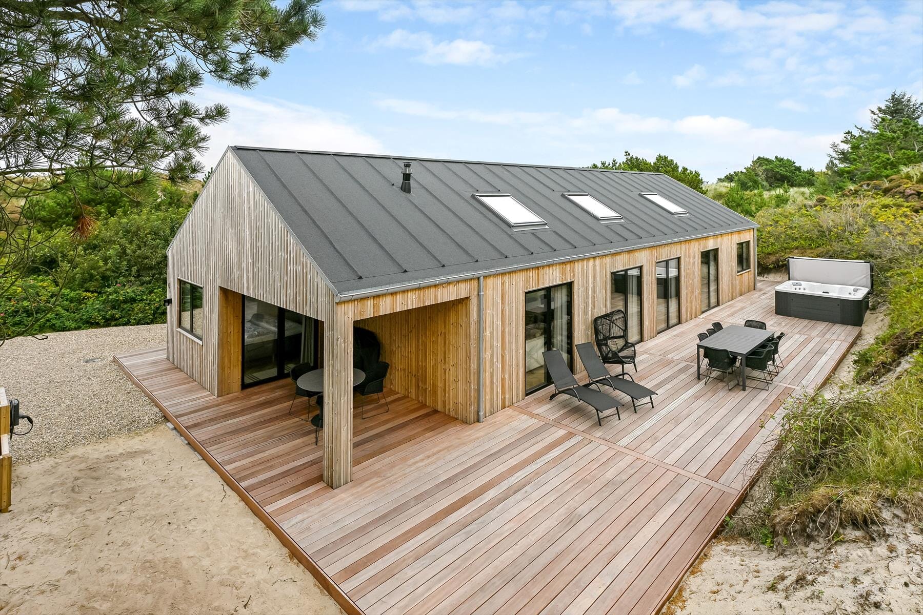 Sommerhuset ligger i en lille gryde omgivet af klitter, så du kan nyde solen og den friske havluft i læ for vinden. På terrassen finder du udespaen – et helt særligt sted at koble af, mens de varme bobler masserer kroppen. Måske vælger du at starte dagen her med et stille øjeblik, eller du slutter den med et glas vin, mens aftensolen farver himlen. Terrassen indbyder til lange måltider under åben himmel, og når solen står højt, kan du finde en god liggestol og bare nyde stilheden, afbrudt af fuglesang og den fjerne lyd af bølgerne. Placeringen giver en dejlig følelse af privatliv, hvor du virkelig kan slappe af uden forstyrrelser.
