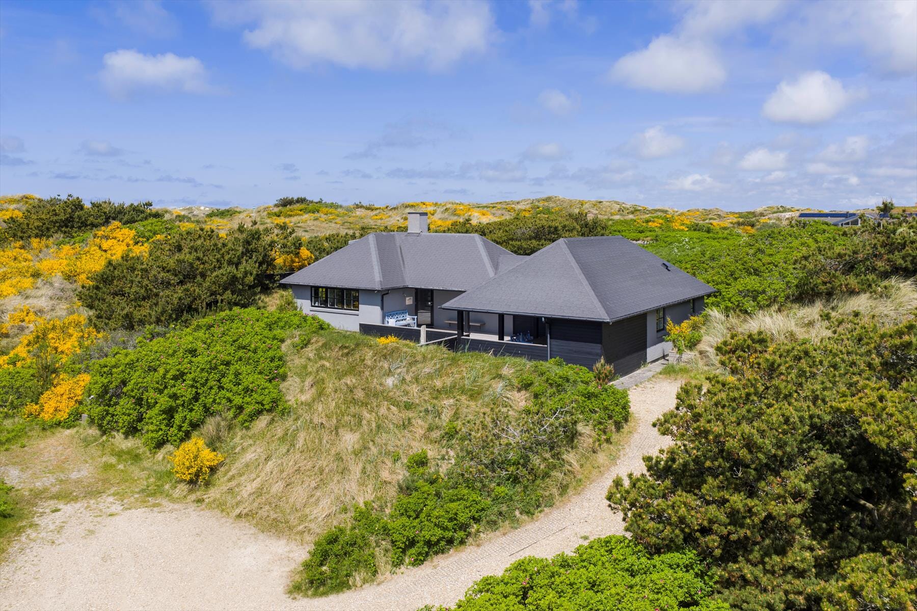 Sommerhusets terrasseområde er en oplevelse i sig selv. Her finder du flere hyggelige hjørner, hvor du kan slå dig ned med morgenkaffen, en god bog eller bare nyde solen i fred og ro. En del af terrassen er overdækket, så du også kan sidde ude, når duggen falder eller vinden rusker mildt i klitterne. Her kan du trække dig tilbage og lade dig omfavne af naturens ro og lydene fra fuglene i baggrunden. De skønne udearealer indbyder både til afslapning og samvær, og placeringen tæt på stranden gør det oplagt at tage en kort gåtur over klitterne, dyppe tæerne i havet og lade Vesterhavets friske brusen rense tankerne. Når du vender hjem igen, kan du skylle saltet af under bruseren og lade kroppen varme i saunaens stille varme – en perfekt afslutning på en dag i det fri.