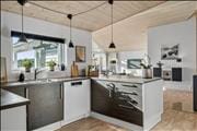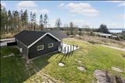 Det 104 m2 store sommerhus ligger højt i landskabet og er udstyret med et kæmpestort panoramavindue, så både dagslyset og udsigten kan nydes fuldt ud i stuen. Også fra det flotte køkken, der ligger i åben forbindelse med stuen, kan I kigge ud på vandet og det bakkede område – og mon ikke maden smager ekstra skønt, når den er tilberedt og bliver indtaget i så smukke omgivelser? I stuen er der for øvrigt energivenlig varmepumpe og brændeovn samt en stor fladskærm med Apple TV, hvor I kan stream film og tv-programmer. Badeværelser er der to af, og på det ene er der vaskesøjle, mens det andet byder på et lækkert spabad og en sauna. Når der skal soves, kan I fordele jer på to dejlige soveværelser, hvoraf det ene er ekstra stort og ligger med flot udsigt til vandet. Det ene værelse er med dobbeltseng (to enkeltsenge, der er skubbet sammen), og det store værelse har både en dobbeltseng og en sovesofa, så i alt har I sengepladser til seks personer.