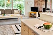 I sommerhuset har I mulighed for at være op til fire voksne og to børn takket den gode rumfordeling og funktionelle indretning. To af soveværelserne er med køjeseng, og det tredje med to enkeltsenge, og på badeværelset er der bruser, så I kan starte dagen med et opkvikkende skyl. Kaffen og morgenmaden kan I gå i gang med at forberede i det tosidede køkken, der ligger i åben forbindelse med den lyse stue. Er det køligt udenfor, kan I tænde for varmepumpen og tage brændeovnen i brug, inden I sætter jer ved spisebordet. Om sommeren har varmepumpen kølefunktion – og I kan selvfølgelig også åbne terrassedøren, så den friske luft kan strømme ind.