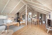 Når du træder ind i sommerhuset, mødes du af en lys og venlig atmosfære, hvor store vinduespartier inviterer naturen helt tæt på. I den rummelige opholdsstue kan du samle familien til hyggelige stunder – uanset om det er over en god middag, en brætspilsaften eller blot til afslapning foran brændeovnen, mens flammerne knitrer og spreder varme. Køkkenet ligger i åben forbindelse med stuen, så det er nemt at være sammen, også når måltiderne tilberedes. Husets soveværelser giver jer hver især mulighed for at finde ro, når dagen går på hæld, og i badeværelset er der god plads til hverdagens rutiner og et bad efter en tur på stranden.