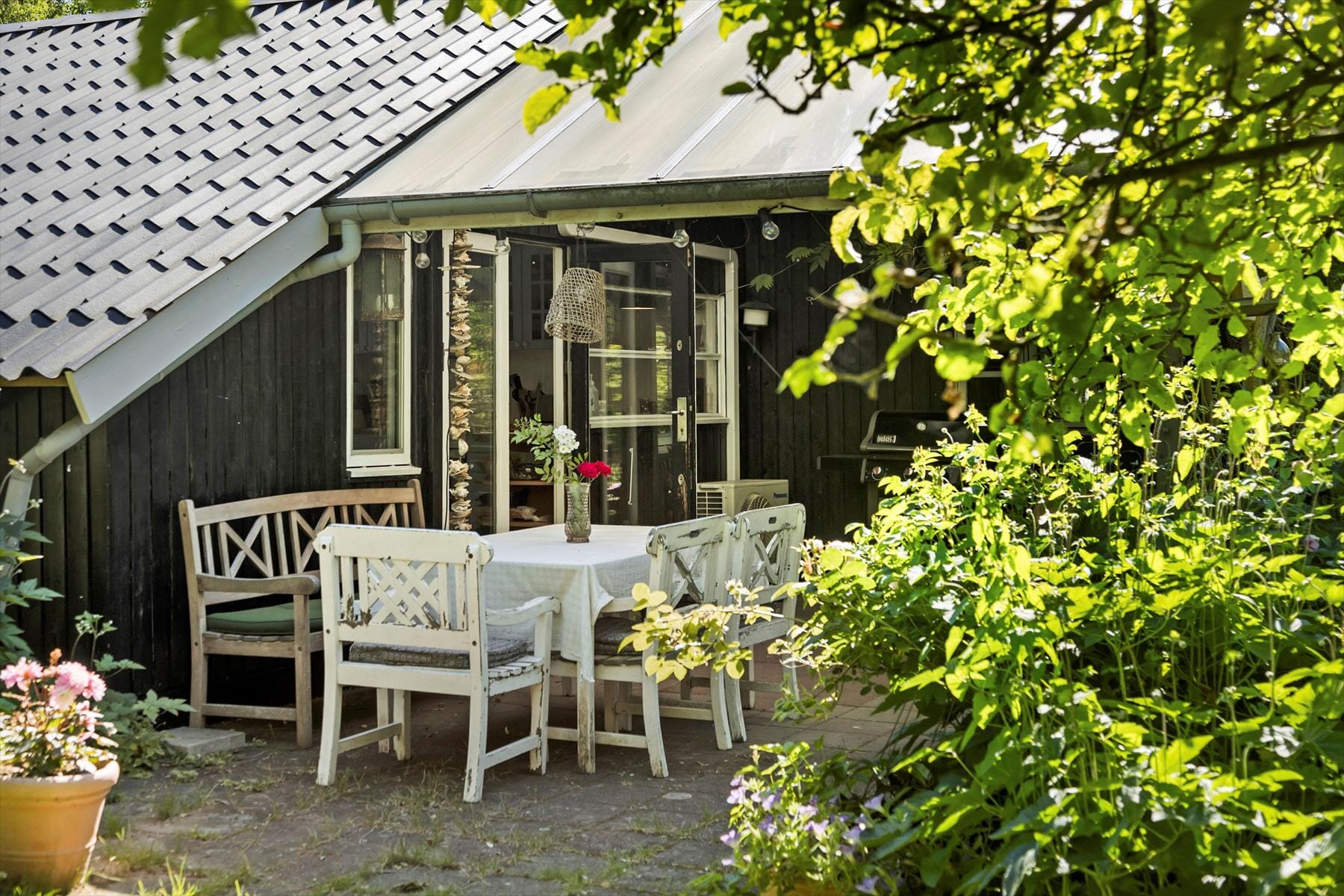 Haven er dejligt lukket og den overdækkede terrasse udenfor huset er perfekt til at samles om et måltid eller blot et glas kølig rosévin i utide.