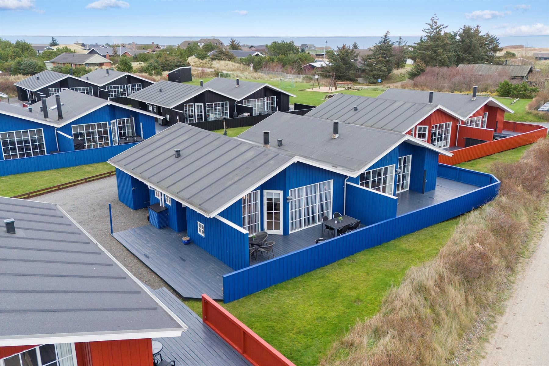 Fra stuen har I direkte adgang til en stor og solrig terrasse, som er perfekt til en rolig eftermiddag eller en aften med grill under den lyse sommerhimmel. Ferieboligen ligger for øvrigt som del af en lille bebyggelse af dobbelthuse, der omgives af græsplæner. Til den ene side er der gode parkeringsforhold, og til den anden ligger et fællesareal med legefaciliteter, petanquebane og boldbane, hvor ikke bare børnene, men hele familien kan boltre sig.