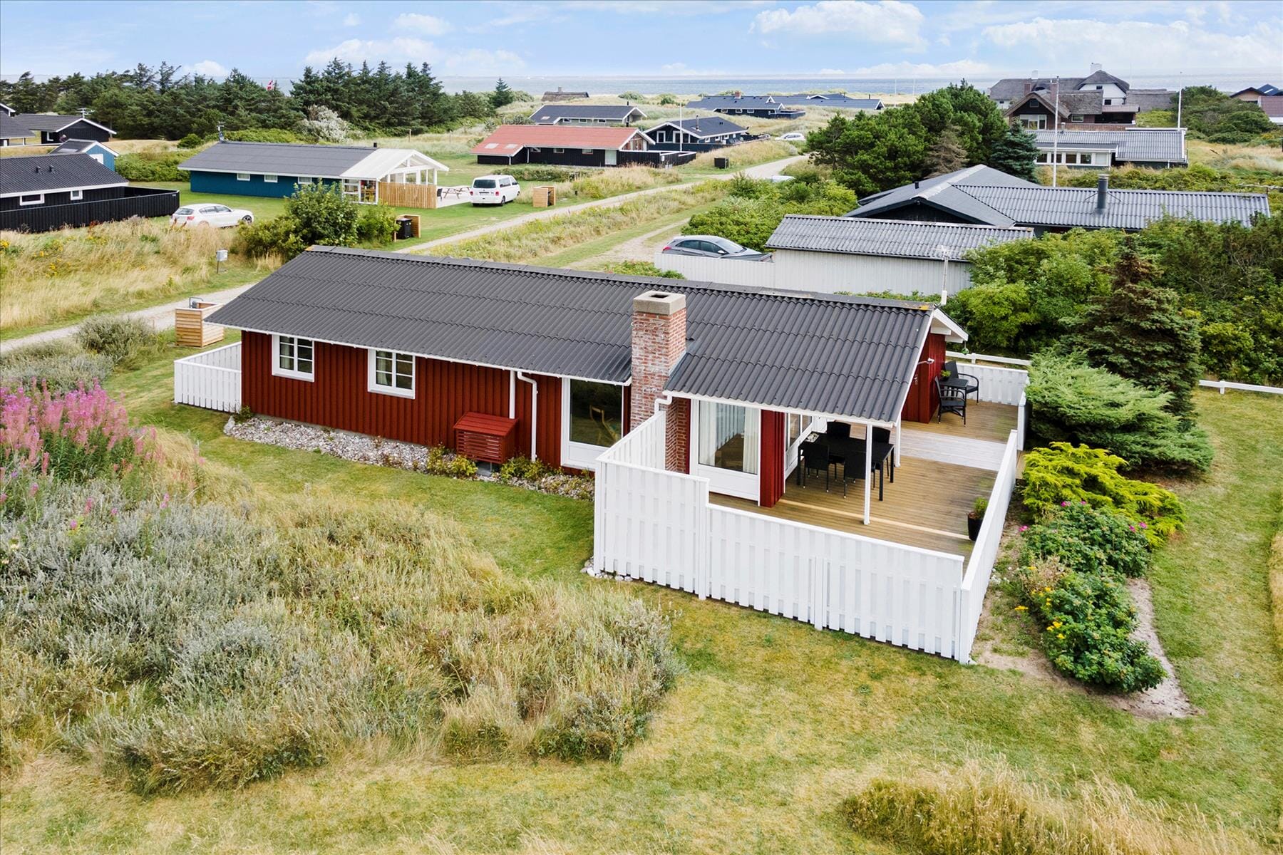 En delvist overdækket terrasse smyger sig omkring huset mod syd og vest, og her har I det ideelle sted at servere frokosten eller aftensmåltidet i solens varme skær. Morgenkaffen kan I nyde på den lille, østvendte terrasse, der har plads til et cafébord. Sommerhuset omkranses af en have, hvor frodig beplantning skaber mange hyggelige kroge. Har I været på fisketur, er den udendørs fiskerenseplads en superpraktisk feature.