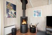 Saunaen og de naturskønne omgivelser er ikke det eneste, der giver huset den helt rette feriestemning, for også stuens brændeovn, det komfortable møblement, kiploftet og væggenes lyse træbeklædning bidrager til det hyggelige helhedsindtryk. Hvis du kan lide at lave mad, vil du blive begejstret for arbejdsforholdene i det åbne køkken: Her er der alt, hvad du skal bruge for at trylle noget lækkert frem, og så kan du endda se lige ud på den fri natur og nyde det smukke indfaldslys, som karnappen giver. Trænger du til at slappe af i sofaen, er der parabol-tv med danske og mange tyske kanaler, og hvis du hellere vil tage en bog med ud i det fri, giver havedøren dig direkte adgang til terrassen.
