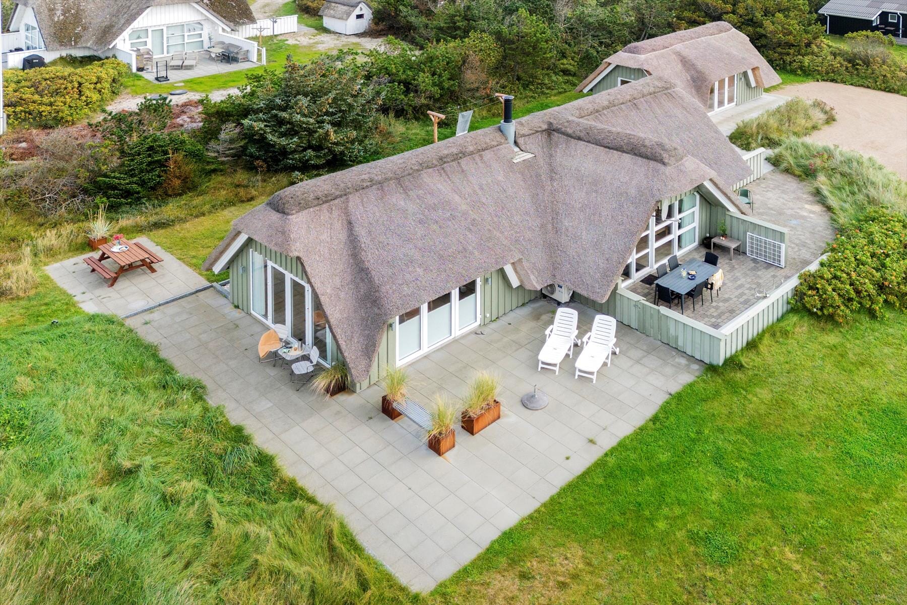 Den 1356 m2 store naturgrund grænser lige op til den fredede klithede, der breder sig ud mod Nr. Lyngvig Strand, så I har det flotteste panoramavue over det åbne landskab og til Lyngvig Fyr. Der er skønne terrasser og solkroge mod både øst, syd og vest, og to af terrasserne er helt aflukkede, så hunden eller de små børn kan løbe og lege i trygge rammer.