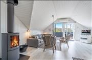 Feriehuset er klassisk indrettet med lyse skrålofter, og stemningen emmer af hygge. Især når I tænder op i brændeovnen og sætter jer til rette i sofaarrangementet med en god bog eller en film i tv’et. Opholdsafdelingen har også en varmepumpe, som sikrer en behagelig temperatur, og stuen glider i ét med et lyst og veludstyret køkken, hvor I kan være sammen om at lave mad, og hvor opvaskemaskinen gør rengøringen let. Feriehusets tre soveværelser giver sengepladser til seks personer, og badeværelset er indrettet med bruseniche og vaskemaskine.