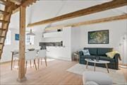 Den 30 m2 store ferielejlighed ligger i Haurvig Strandgaards østlige længe, og den er blevet etableret som del af et større renoveringsprojekt i 2023. En arkitekt har stået for ombygningen, så den lever op til ejendommens fredningskrav, og det betyder samtidig, at I kan slappe af i både flotte og funktionelle rammer. Inden døre har I plads til 2-4 voksne og 1 hund. Her kan to personer overnatte på hemsen og to i opholdsrummet. Sidstnævnte er en hyggelig stue med dobbelt sovesofa, spisebord, tv og åbent køkken, og ved siden af ligger et pænt brusebadeværelse. Både badet og opholdsrummet har gulvvarme, og den gode wi-fi-forbindelse sørger for, at I nemt kan følge med i nyhederne og sende feriefotos til venner og familie. Entréen deler I med nabolejligheden. Alle 3 lejligheder er oplagte at booke, hvis I rejser sammen med flere familier.