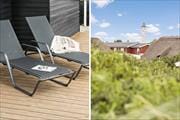En stor og solrig terrasse breder sig rundt om sommerhuset, og den er ikke bare delvist overdækket, men også helt aflukket, hvilket familier med hund eller små børn sikkert vil værdsætte. Naturgrundens græsplæne vil sikkert også appellere til de yngste gæster – ikke mindst fordi den byder på en sandkasse og et legetårn med rutsjebane og gynger.