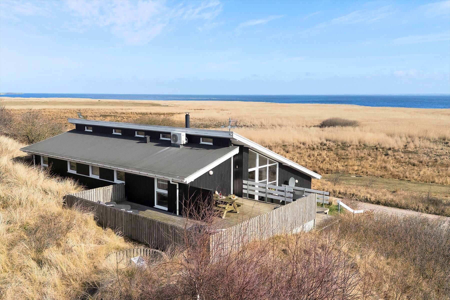 Den skønne, sydvendte terrasse er et helt særligt samlingspunkt. Her kan du nyde solen det meste af dagen og lade blikket vandre ud over den altid foranderlige Ringkøbing Fjord – en udsigt, der sjældent er den samme som i går.