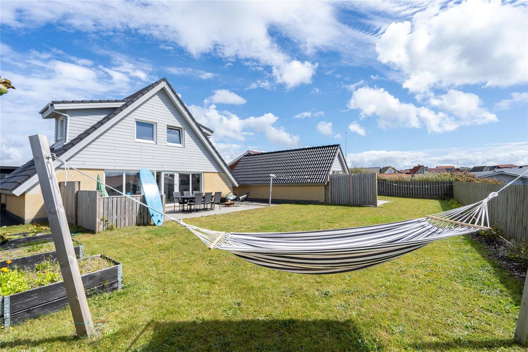 Hus-ID: 787Midt i Hvide Sande og bare 250 meter fra Vesterhavet finder I dette dejlige sommerhus, der ligger på en tilbagetrukket grund sammen med et velindrettet anneks. I annekset er der tekøkken og badeværelse, så det fungerer som sin egen lille boligenhed, og derfor kan I roligt invitere familien eller vennerne med på ferie.