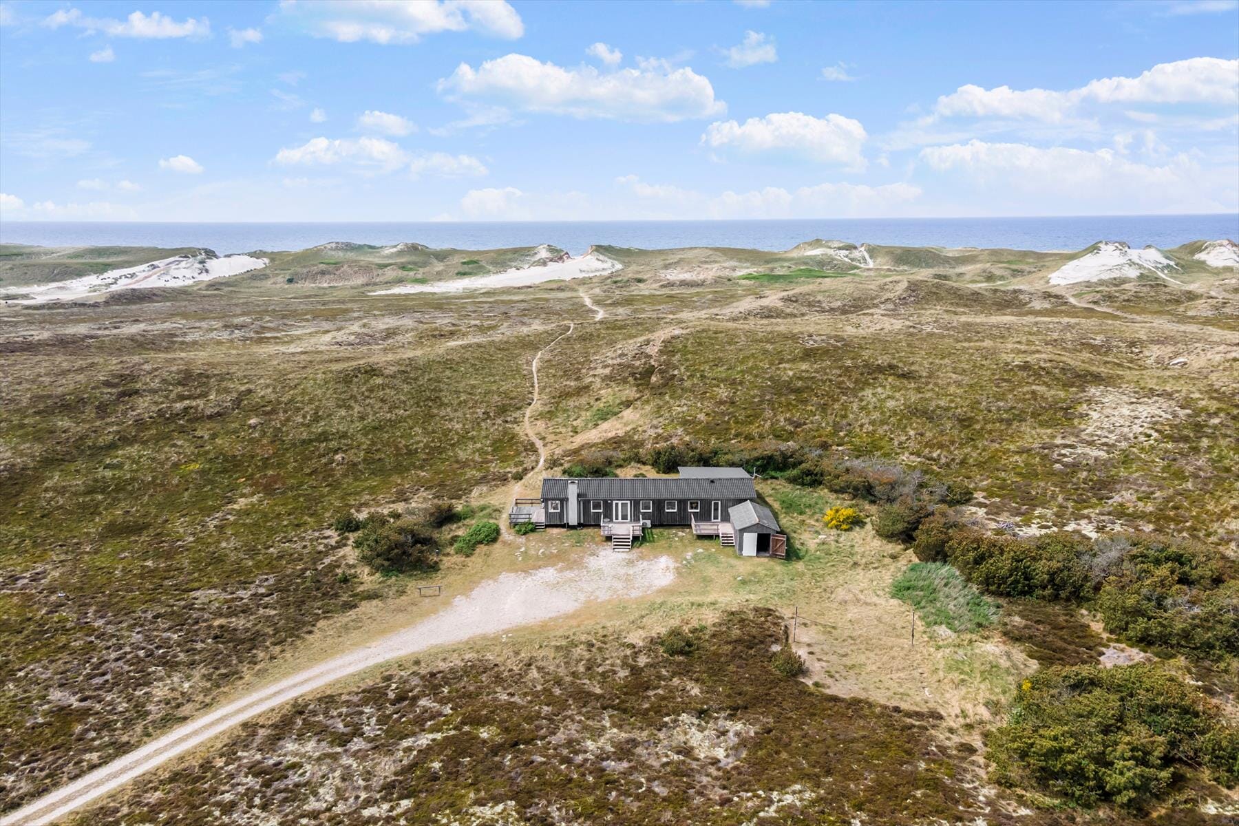 Drømmer I om at have masser af plads omkring jer og smuk natur til alle sider, når I holder ferie? Så skal I sætte kursen mod dette hyggelige træsommerhus, der ligger på vidtstrakt naturgrund på næsten 15 hektar. Vesterhavet og Bjerregård Strand venter bare 400 meter væk, og mod øst kan I nyde den smukke udsigt over det åbne land mod Ringkøbing Fjord.