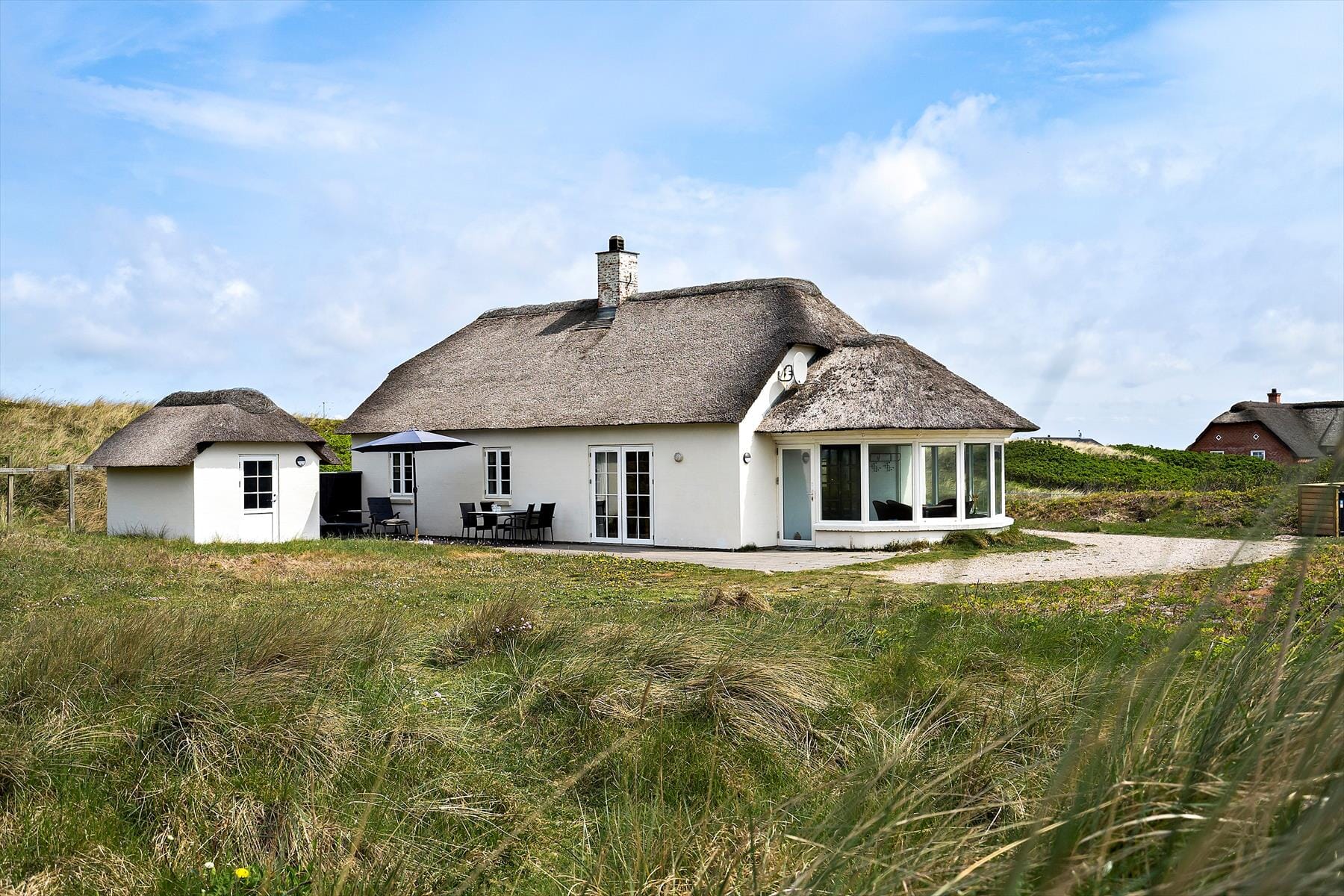 Stråtækt sommerhus med skøn udestue og naturskøn adresse ud mod stranden