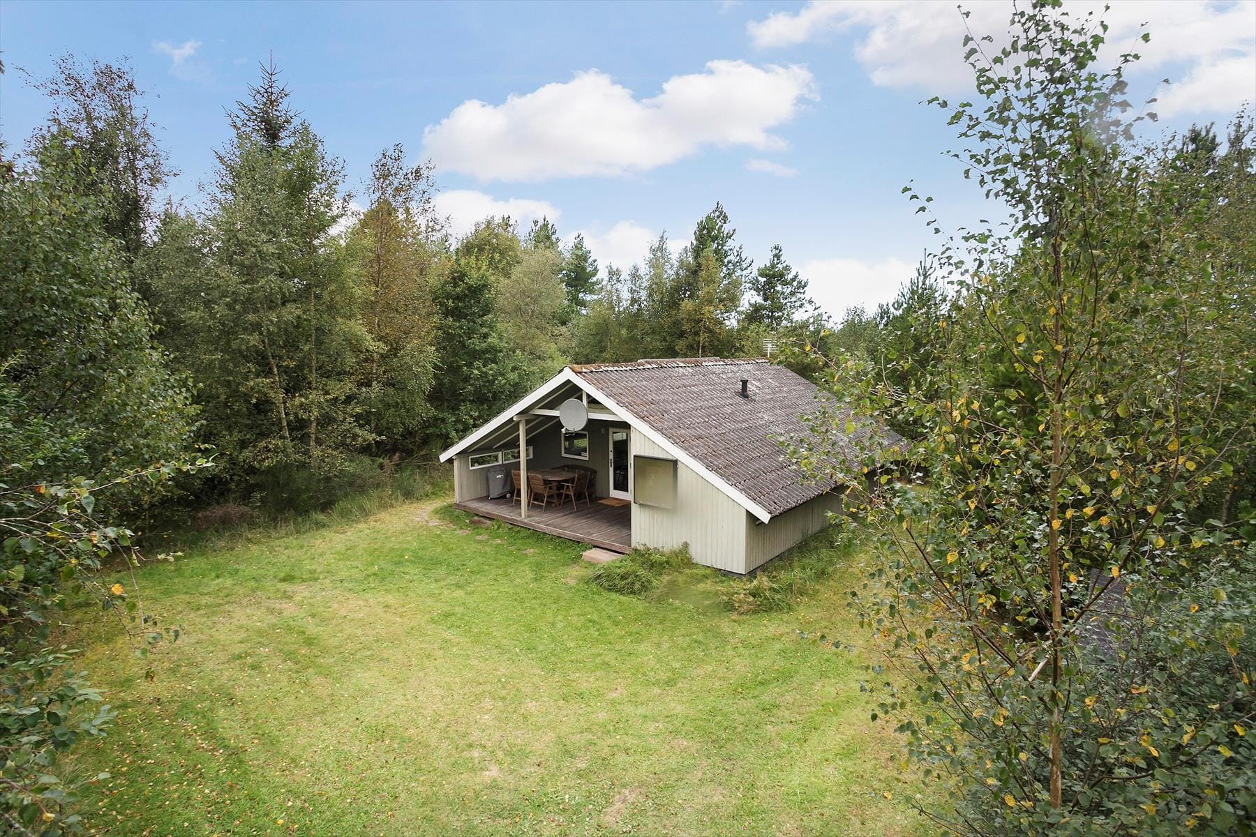 Foran hovedhuset har I en overdækket terrasse, som med sin sydvendte placering er en skøn og solrig opholdsplads. Grunden er med sine 2.852 m2 særdeles stor, og beplantningen sørger for, at I kan sidde helt uforstyrret. Man får virkelig fornemmelsen af være midt i naturen, og det er da heller ikke sjældent, at vilde dyr kommer på visit forbi sommerhuset.