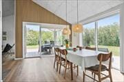 Det 87 m2 store sommerhus har et stilrent udtryk med umalet træbeklædning, mørkt sadeltag og store vinduespartier, der sørger for et godt lysindfald inden døre. Indretningen er lys og let, så der er en skøn atmosfære i rummene – ikke mindst i stuen, der har loft til kip, brændeovn, integreret køkken og hems. To af husets soveværelser er udstyret med dobbeltseng og det tredje med en dobbelt sovesofa. Sommerhusets høje kvalitet fremgår også af det rummelige brusebadeværelse, og selv entréen er et pænt og velindrettet rum med vaskemaskine og tørretumbler.