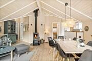 Dette sommerhus hører til i vores kategori for luksussommerhuse; her er nemlig alt indenfor hårde hvidevarer, gode møbler, moderne teknisk udstyr og oveni en fantastisk flot beliggenhed med god udsigt og store chancer for at se rådyr og andet vildt spadsere forbi udenfor vinduerne. Med syv sengepladser og to badeværelser er her god plads til en stor familie; det ene badeværelse er udstyret med spabad og sauna, og her kan man også vaske og tørre tøj. Køkken, spisestue og stue hænger sammen i ét stort, åbent rum med en flot brændeovn til at sprede varme og hygge på kølige morgener eller aftener. Et dejligt hus med en god kombination af hygge, komfort og luksus!