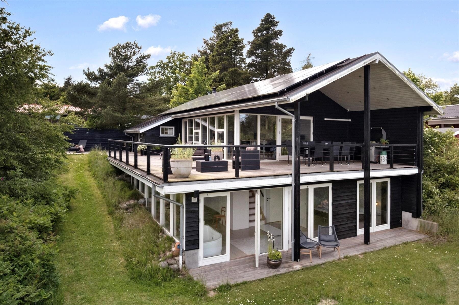 Rummeligt sommerhus i to plan med spa, ak­ti­vi­tets­rum og ugeneret be­lig­gen­hed – fan­ta­stisk udsigt over naturen fra både stuen og den fan­ta­sti­ske terrasse.
