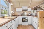 Det er nemt at føle sig hjemme i det 90 m2 store sommerhus, der har loft til kip, lyse trælister på væggene og komfortabelt møblement. Foruden den førnævnte brændeovn er der sofaafdeling og spisebord i stuen, og en disk med barstole markerer overgangen til køkkenet, hvor I kan trylle noget lækkert frem både morgen, middag og aften. I entréen er der vaskemaskine, mens husets syv sengepladser er fordelt på tre soveværelser, og endelig fuldendes planløsningen af et stort badeværelse med hjørnespabad, sauna og bruseniche.