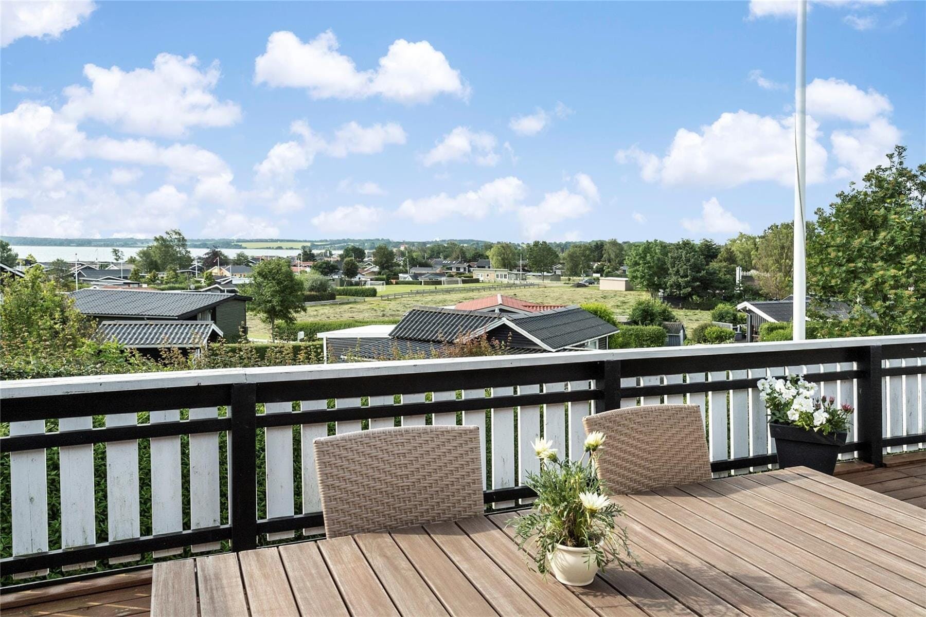 Huset er omkranset af den dejligste træterrasse. Herfra kan udsigten også nydes. Terrassen har både vindsejl og markise og bliver derfor hurtigt til et opholdssted det meste af dagen. På terrassen er også et udekøkken (dog kun med koldt vand).