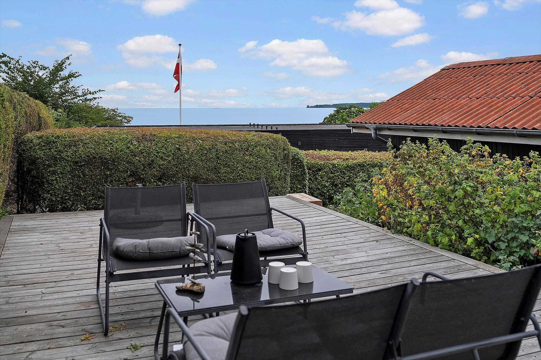 Udendørsområdet byder på flere skønne terrasser, hvor du kan nyde udsigten med havudsigt – eller slå dig ned på den overdækkede terrasse. Den store have med rummelig græsplæne er ideel til leg, spil og solbadning. Du kan slappe af i de komfortable solstole på terrassen og lade hverdagens stress smelte væk, mens du nyder udsigten ned mod vandet.
