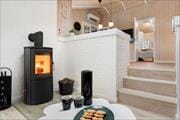 I sofahjørnet ved det store vinduesparti skaber brændeovnen en varm og hyggelig stemning. Her kan I slappe af med en god bog eller en film – det perfekte sted at lade roen sænke sig.