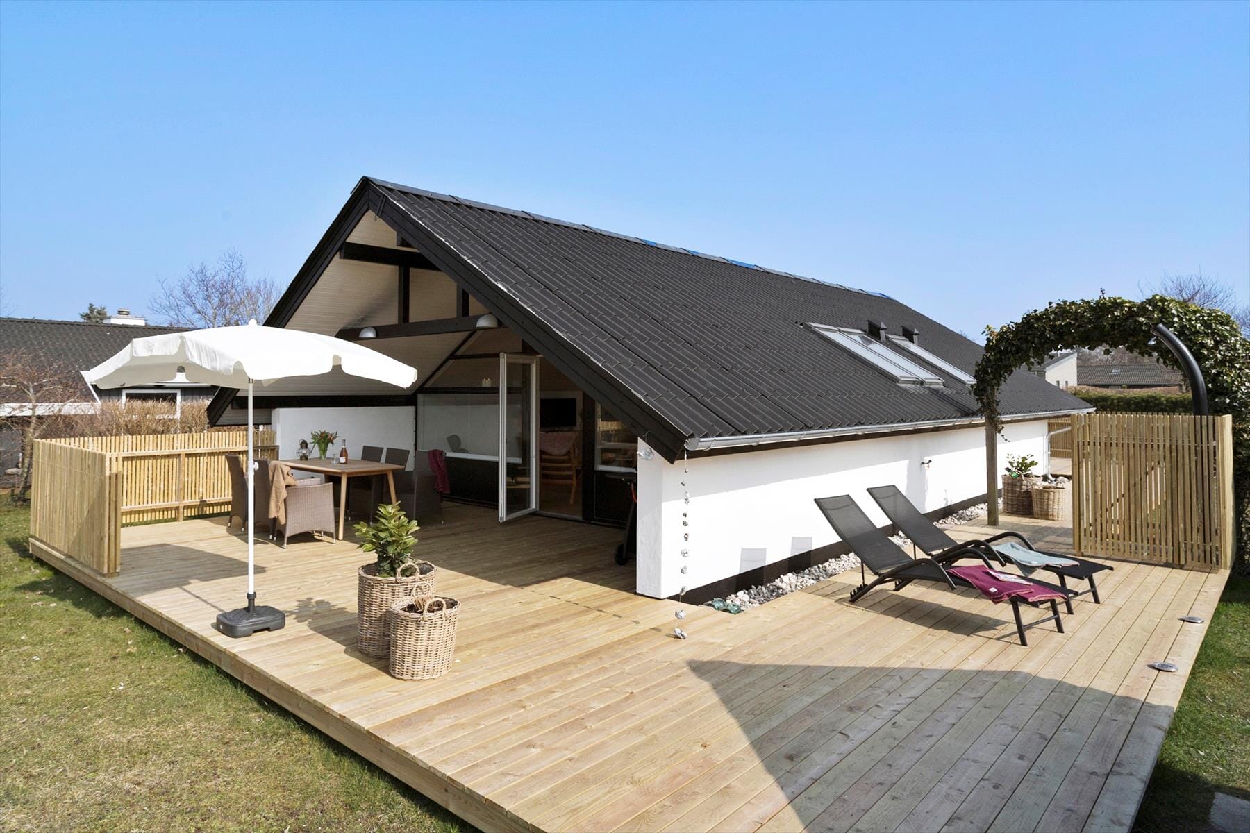 Fra stuen er der direkte udgang til stor træterrasse som binder hus og have flot sammen.