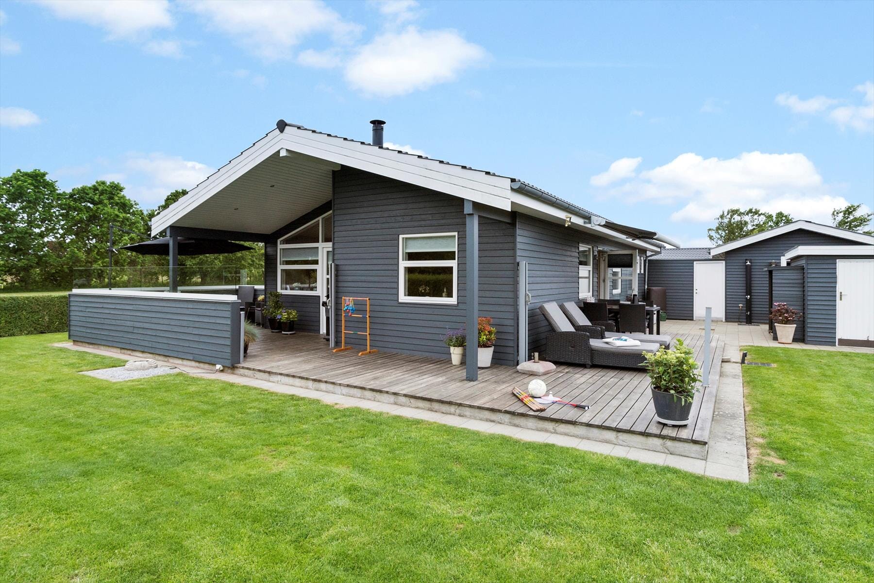 Dette sommerhus ligger i et skønt som­mer­hu­s­område med kun 300 m. til en god sand­strand. På husets to terrasser finder i gode havemøbler, så I kan sidde be­ha­ge­ligt og nyde udelivet. Hvis I vil solbade er der flere lig­ge­sto­le, som I kan dase i med en god bog. Derudover er der mulighed for at tilberede feriens måltider på husets gasgrill. I haven er der plads til fri leg og