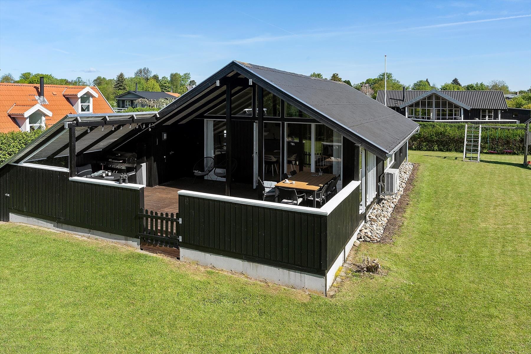 Huset ligger i dejligt roligt sommerhusområde – knap hundrede meter fra vandet og badebro. Er omkranset af pæn stor plæne med plads til leg og boldspil og en lille hæk. Dejlig stor delvis overdækket træterrasse med læ i den ene ende af huset samt ligeledes træterrasse ved indgang til huset i den anden ende. Der er grill og havemøbler til fri afbenyttelse.